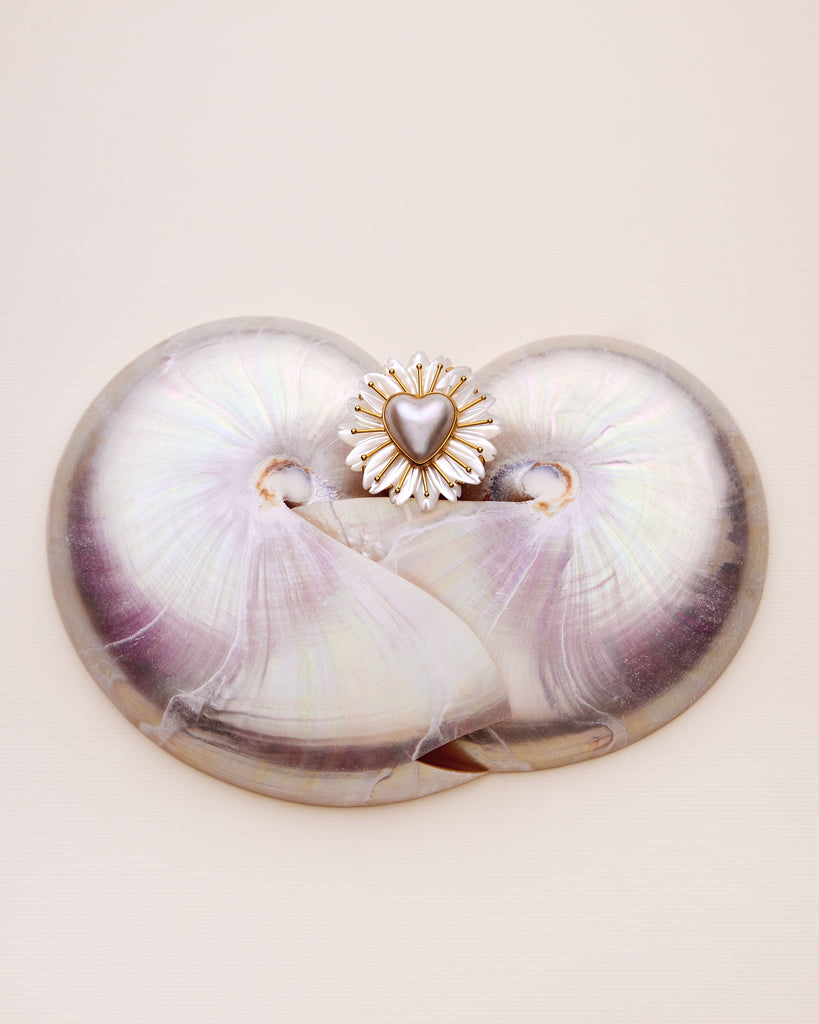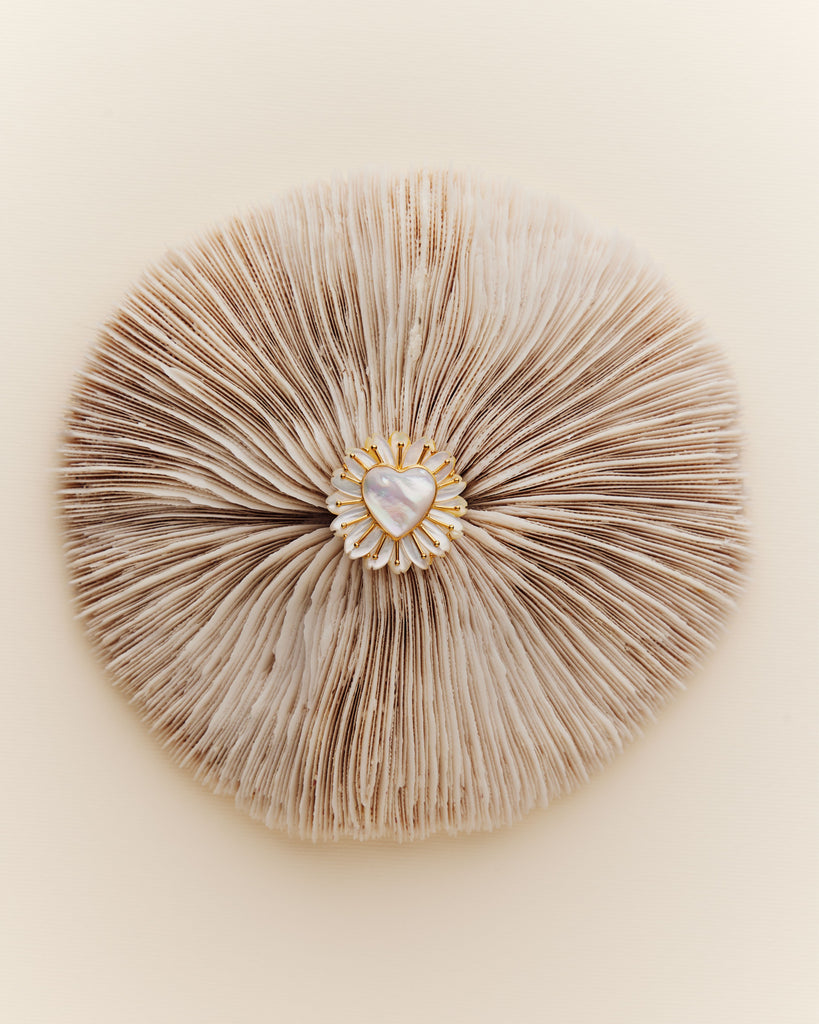Bathed in the glow of coastal light, this luminous necklace is meticulously handcrafted in 18k yellow gold. Embellished with a radiant mother of pearl flower accented with delicate gold rays and crowned with a glowing mother of pearl heart, this exquisite piece creates a symphony of playfulness and shimmer that is sure to captivate.