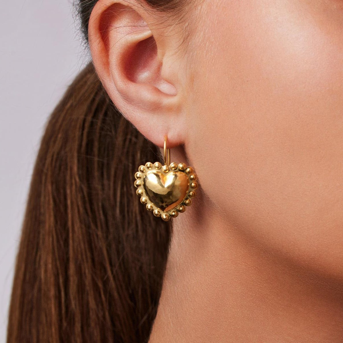 A stunning pair of heart drop earrings handcrafted in hammered 18k yellow gold.