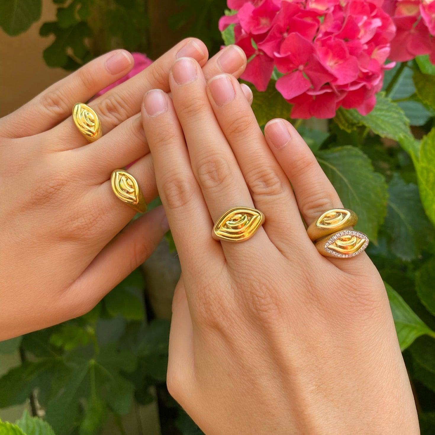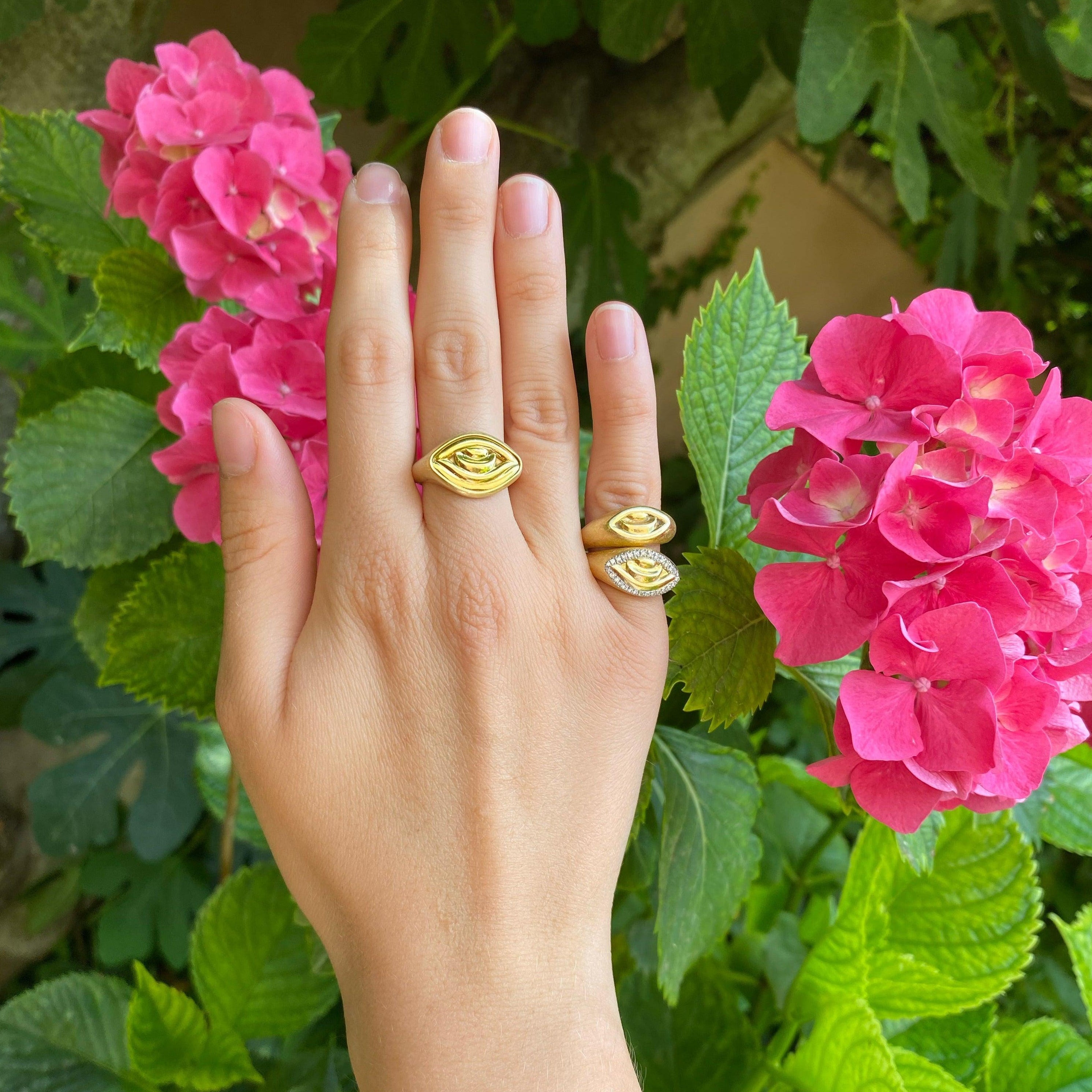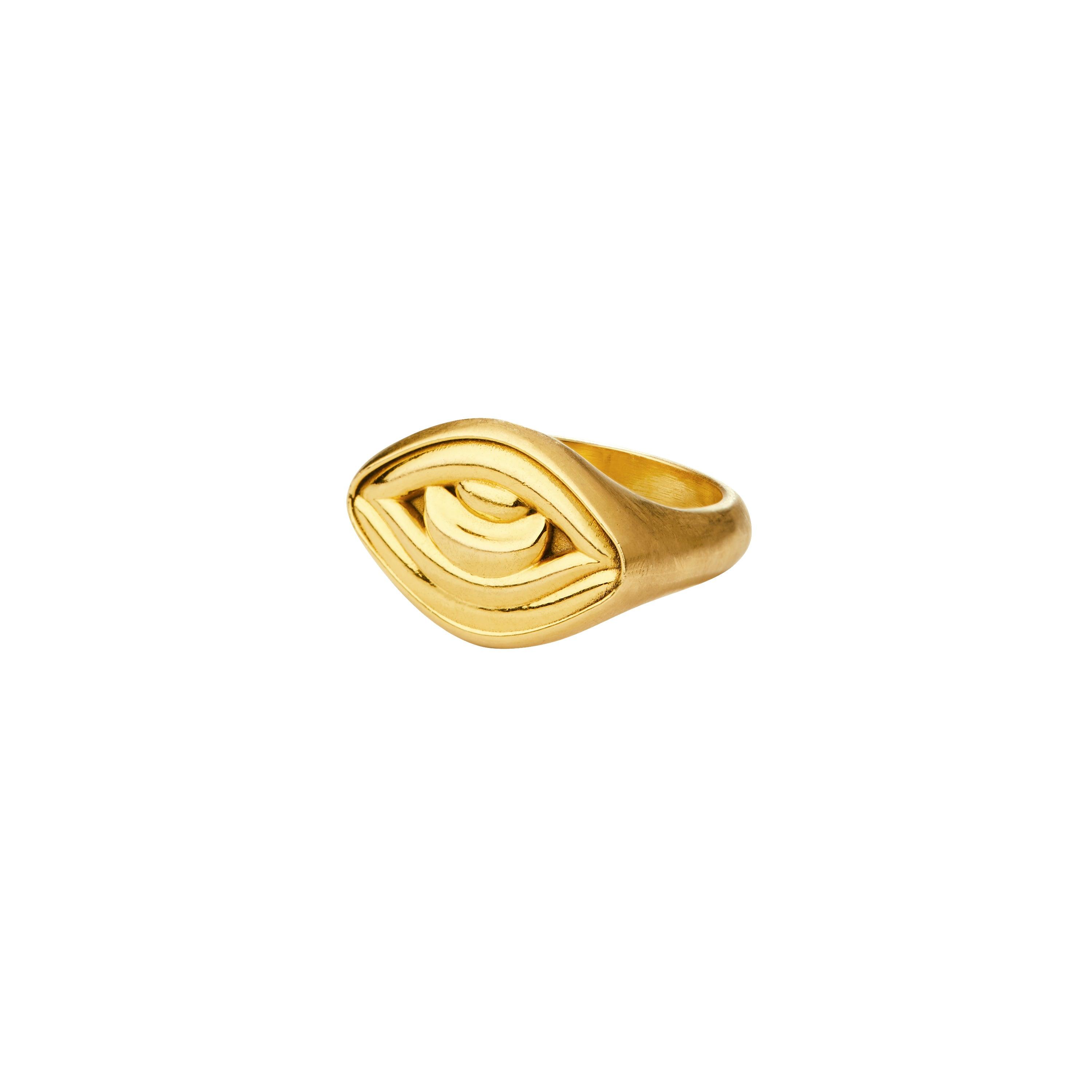 A captivating talisman ring with a carved protective eye on a brushed band handmade in 18k yellow gold.