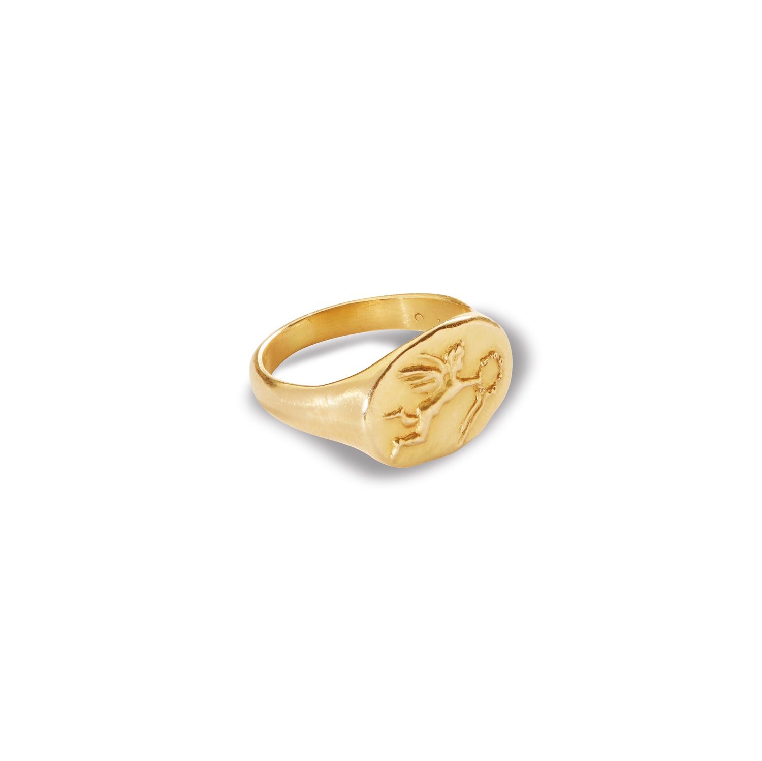 A stunning ring intricately handcrafted in 18k yellow gold featuring a flying Eros, the winged god of Love.