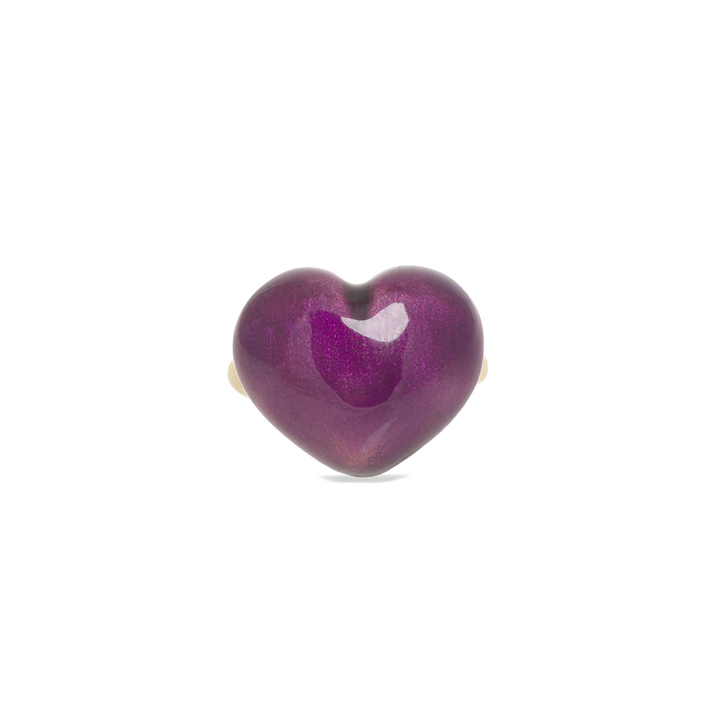 This exquisite ring consists of a voluptuous heart fashioned in stelring silver and finished with enticing purple enamel. Set on a 14k yellow gold band, this ring is sure to elevate your mood and add just the right amount of playfulness to your look.