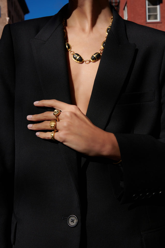 An extraordinary necklace handmade in 18k yellow gold set with exquisite black agate scarabs. The centre scarab features an opening clasp that allows you to wear it separately as a pendant, giving you the opportunity to style the necklace in different ways. The textured surface of the bezel and clasp adorning the scarabs is carefully crafted to evoke the unique texture of ancient jewellery.