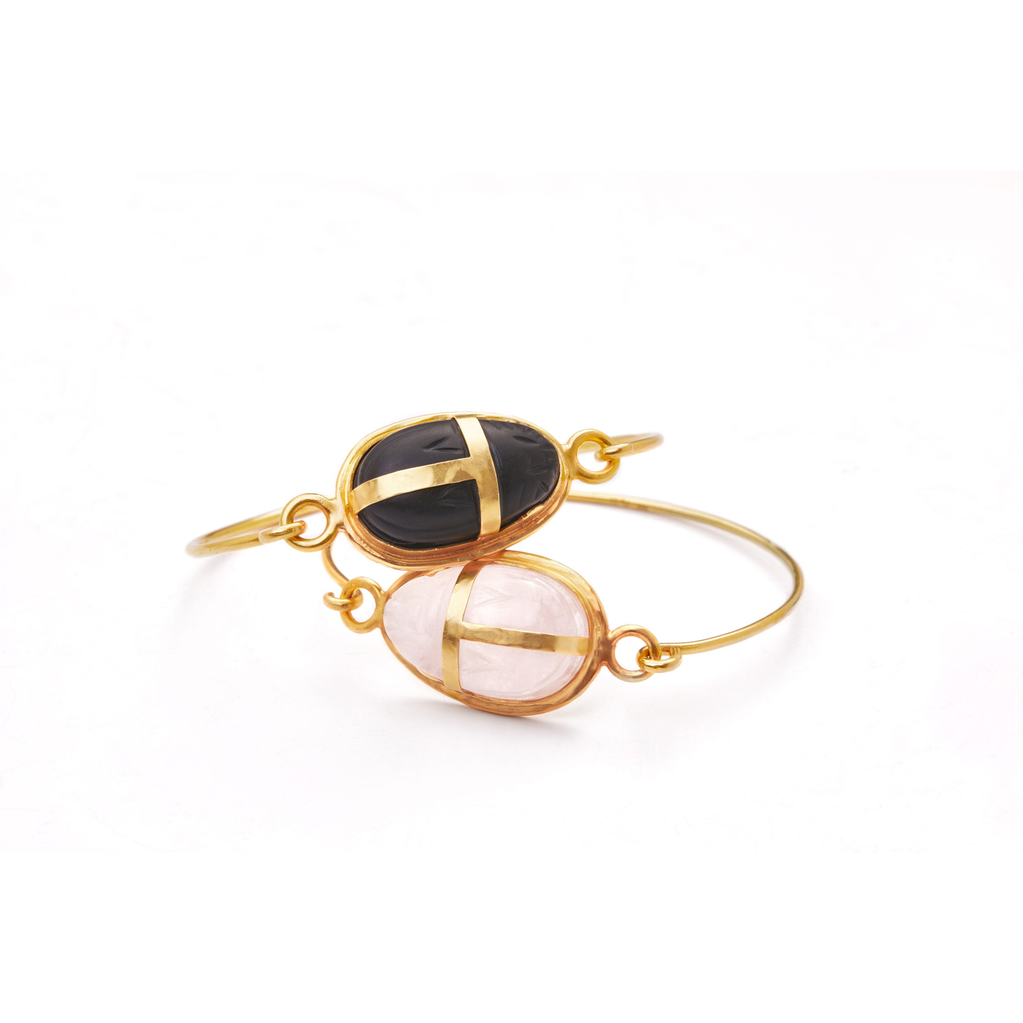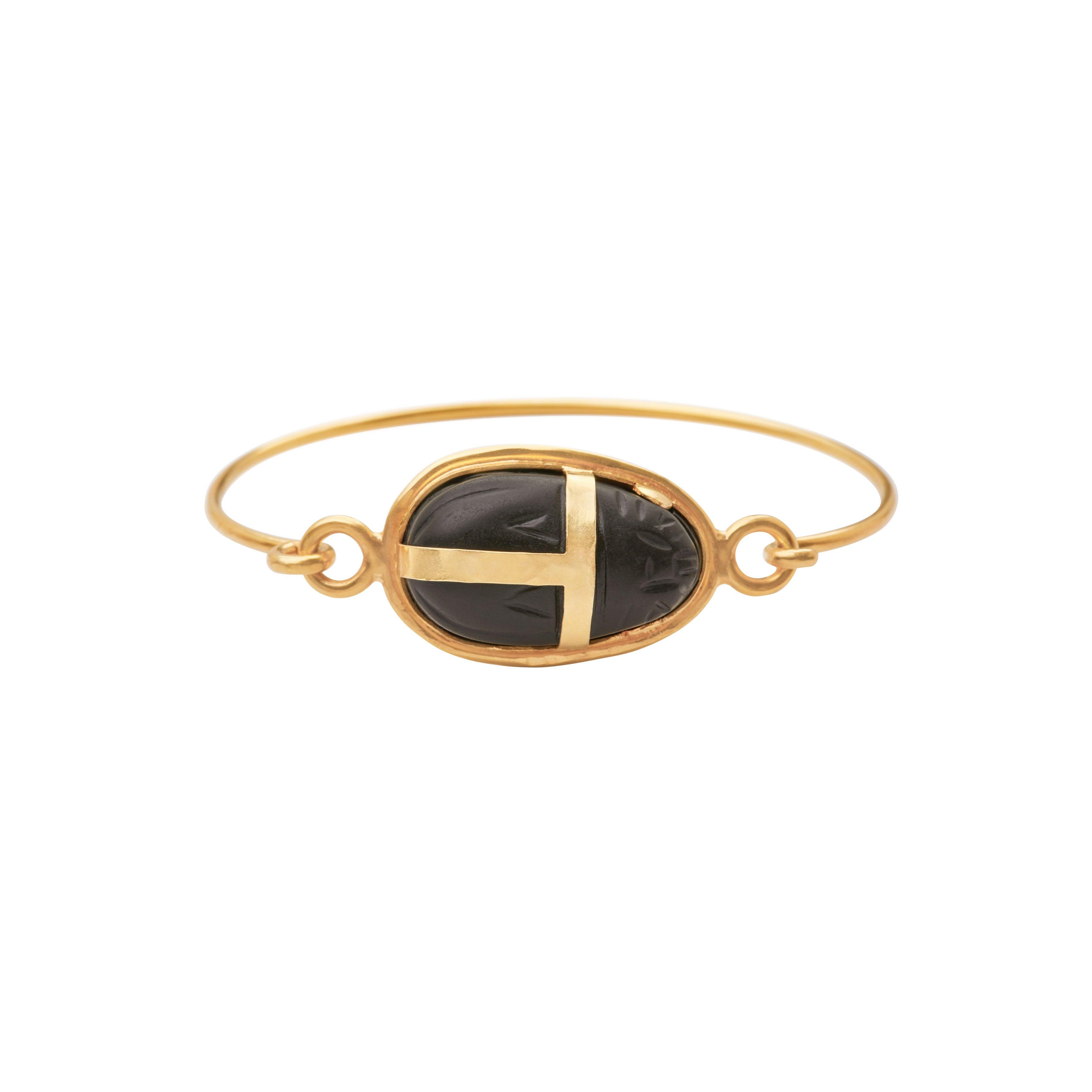 A captivating cuff featuring a black agate scarab set on intricately textured 14k yellow gold. The textured surface of the bezel and band adorning the scarab is carefully crafted to evoke the unique texture of ancient jewelry.