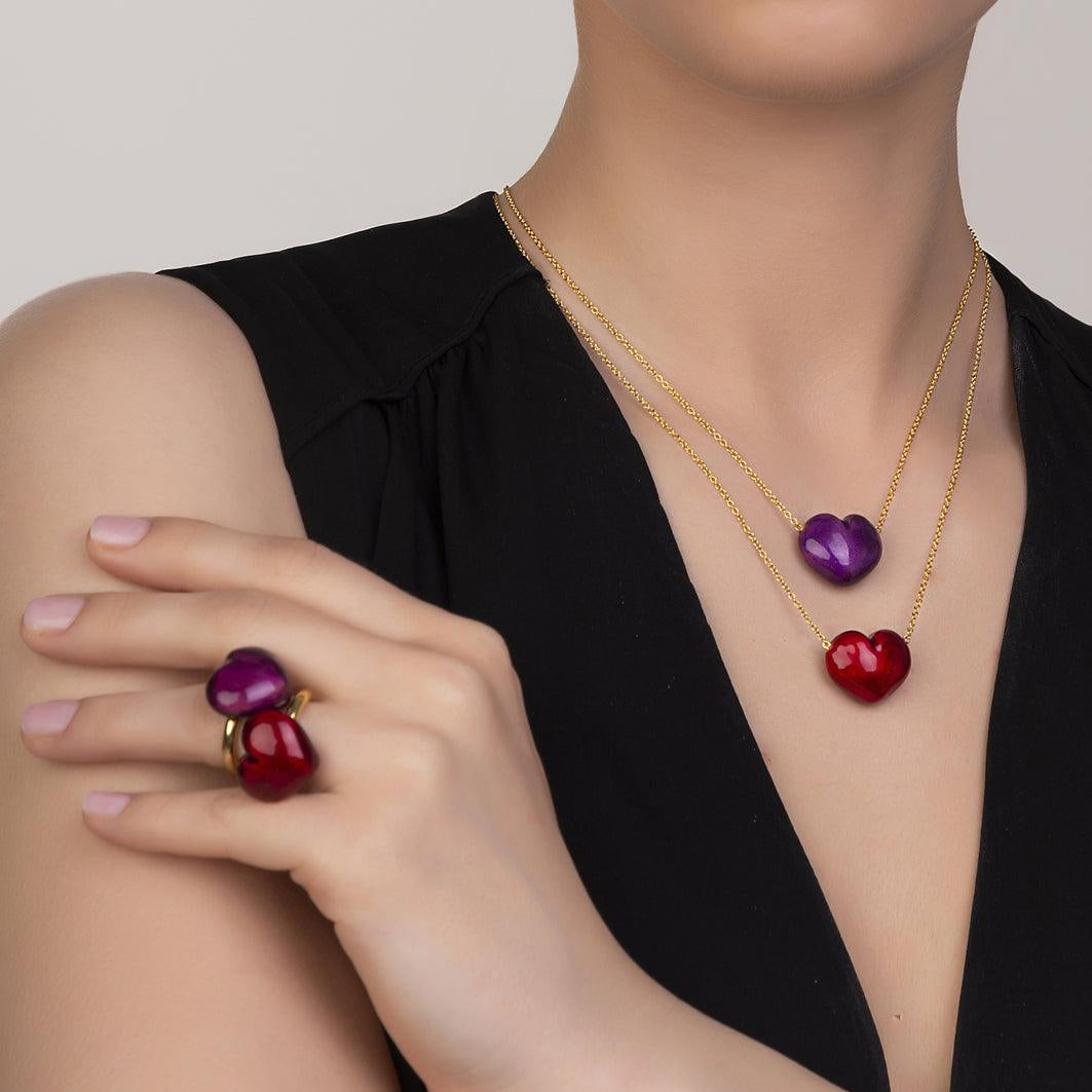 This necklace is adorned with a voluptuous heart in sterling silver and finished with alluring purple enamel. Offering a an uplifting pop of color set on a dainty 14k yellow gold chain, this necklace is the essence of playful elegance.